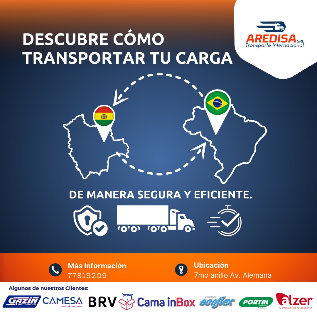 Somos líderes en transporte internacional y logística integral, especializados en la ruta Brasil-Bolivia. 📦✈️ Con un enfoque en eficiencia y puntualidad, garantizamos que tus mercancías lleguen a su destino de manera segura y a tiempo. 🕒✅